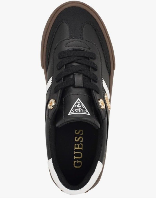 Las Guess Loui combinan estilo deportivo con un toque elegante y moderno. Confeccionadas en poliuretano (PU) con detalles en gamuza y cuero sintético, presentan un diseño negro con franjas blancas y el logo Guess en dorado, que aporta distinción sin perder comodidad.