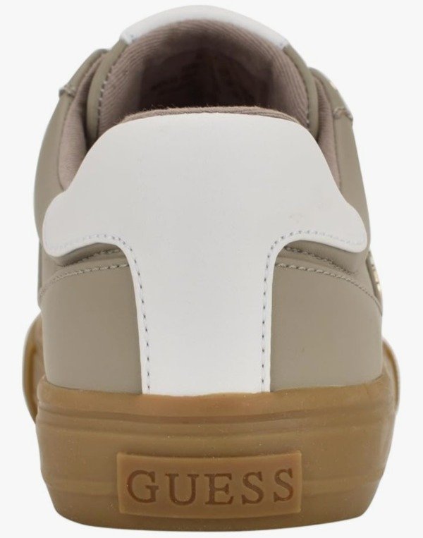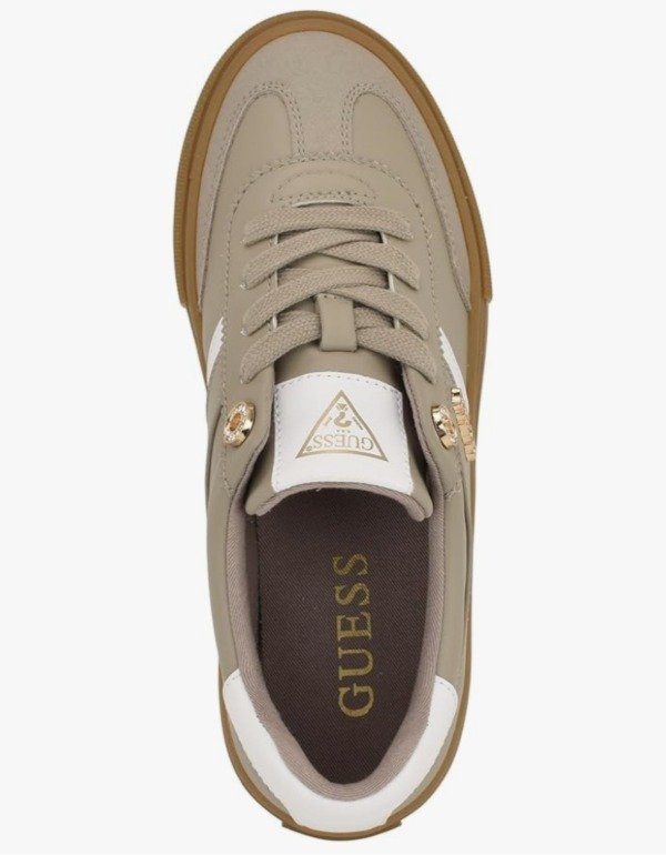 Las Guess Loui combinan estilo deportivo con un toque elegante y moderno. Confeccionadas en poliuretano (PU) con detalles en gamuza y cuero sintético, presentan un diseño beige con franjas blancas y el logo Guess en dorado, que aporta distinción sin perder comodidad.