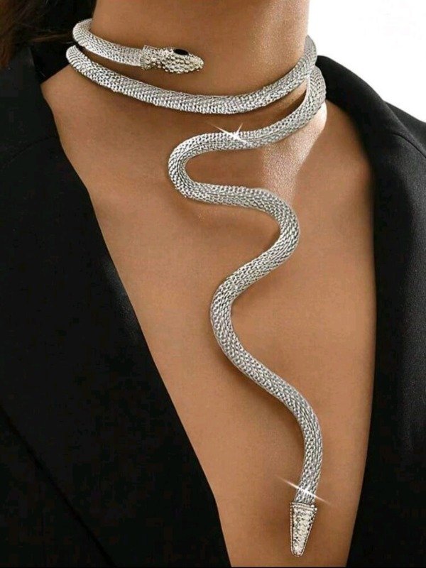 Collar tipo gargantilla con diseño de serpiente flexible, completamente recubierto en brillantes de imitación, que aportan un toque glamoroso y sofisticado.