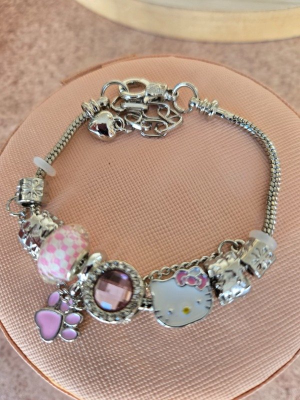 Pulsera importada inspirada en Hello Kitty, con dijes en tonos rosa pastel y plateado. Incluye el icónico charm de Hello Kitty, una huellita esmaltada, cuentas rosadas y símil cristales brillantes que aportan un toque dulce y femenino. Ideal para regalar o sumar a tu colección kawaii.