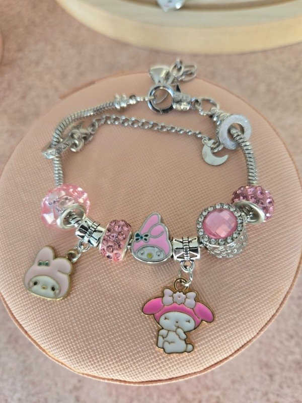 Pulsera inspirada en My Melody de Sanrio, con dijes esmaltados en tonos rosa pastel y plateado. Incluye cuentas con brillo, símil cristales facetados y detalles delicados que le dan un aire dulce y encantador. Ideal para quienes aman los accesorios tiernos y con estilo kawaii.