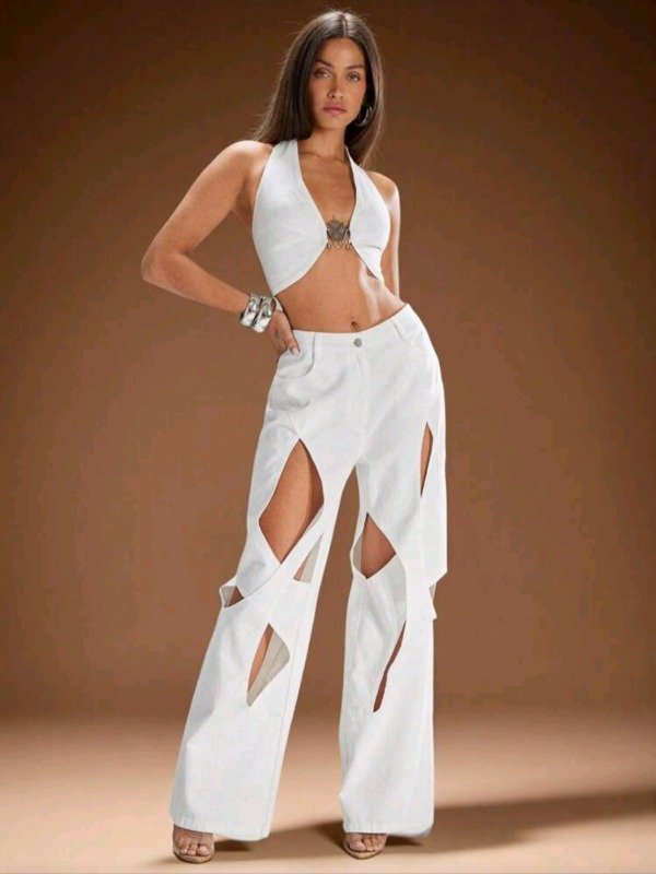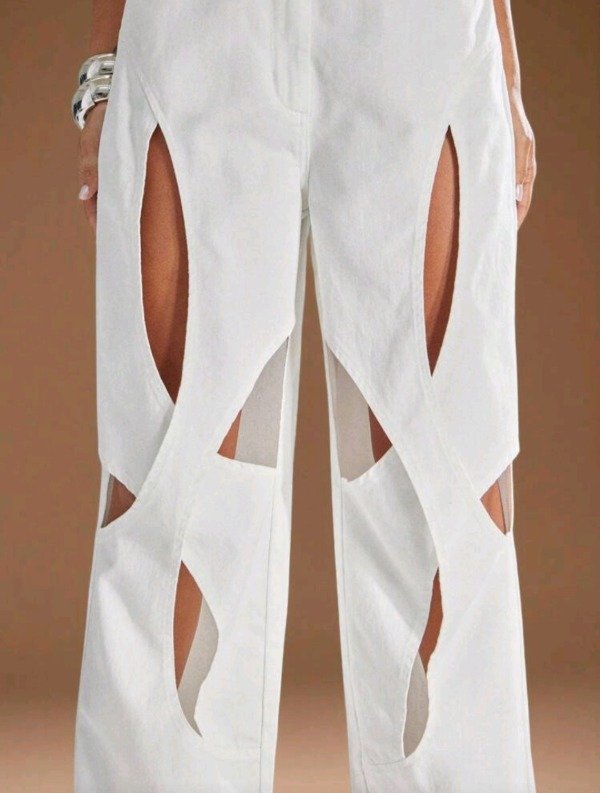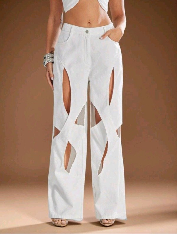 Pantalón de mujer Denimoi con diseño calado / recortes geométricos, moderno y ultra fashion. Confeccionado en tela con más del 70% de algodón, ofrece estructura, comodidad y un look único que no pasa desapercibido 🤍