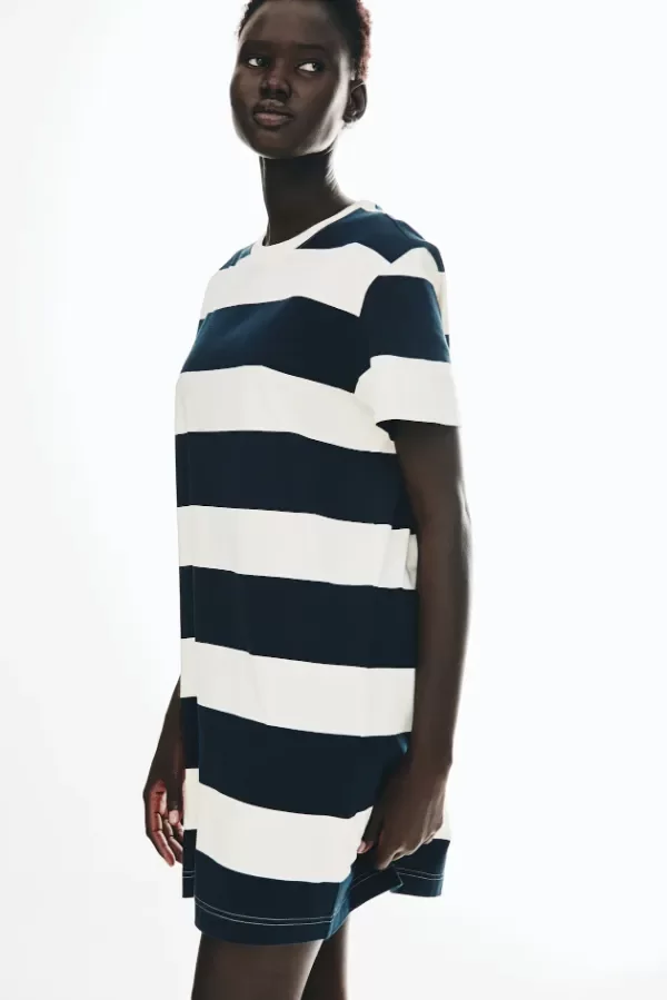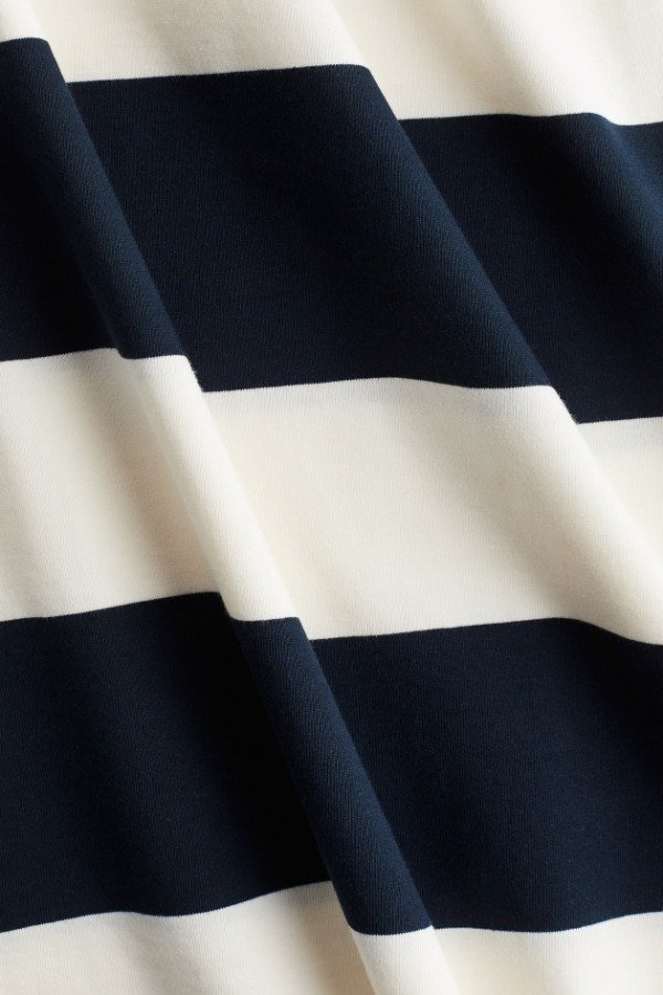 Remerón H&M importado, confeccionado en algodón suave y cómodo, con diseño rayado azul marino y blanco. Corte recto y relajado, cuello redondo y manga corta, ideal para un look casual, playero o urbano.