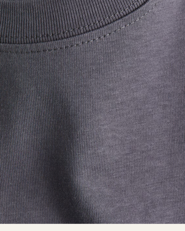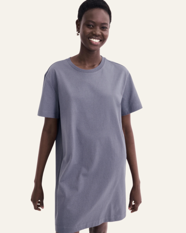 Remerón H&M importado, confeccionado en algodón suave con diseño liso color gris humo. Corte oversized tipo vestido, cuello redondo y manga corta. Ideal para usar con zapatillas o sandalias, para un look relajado y moderno.