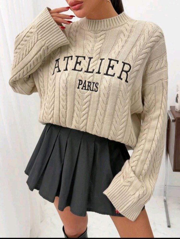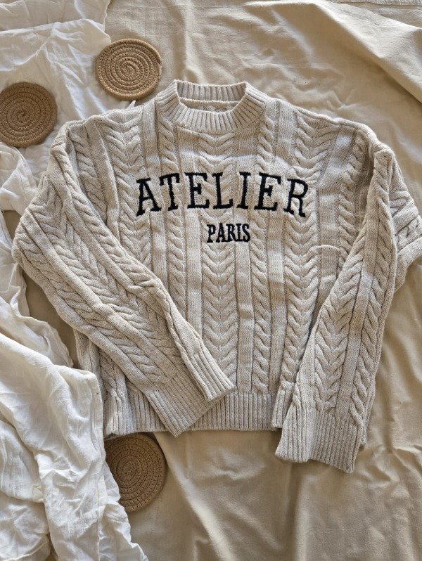 Sweater importado para mujer, confeccionado en tejido trenzado grueso con diseño oversize y estampa frontal "ATELIER PARIS". Su estilo combina lo clásico del punto cableado con el toque urbano y moderno del bordado.