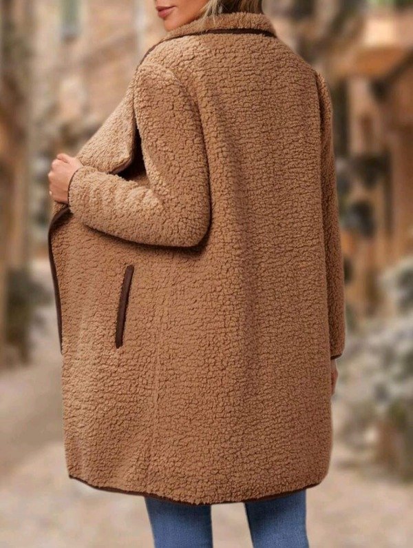 Abrigo largo estilo teddy en tono camel cálido, emery rose.