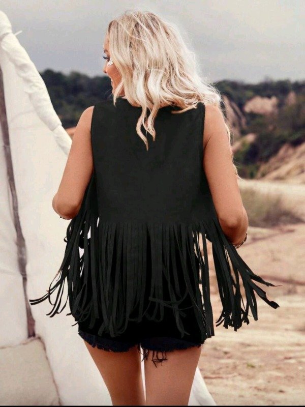 Chaleco estilo occidental / boho con flecos largos y detalles de tachas metálicas en la parte frontal. Una prenda súper canchera para levantar cualquier look: festivales, salidas, playa o un outfit casual con onda.