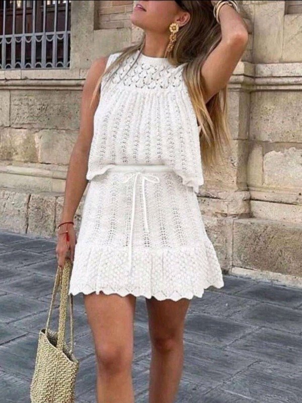 Un conjunto fresco, delicado y súper femenino, ideal para vacaciones, verano y días de calor. Su tejido calado estilo crochet aporta textura, movimiento y un look playero elegante sin esfuerzo.