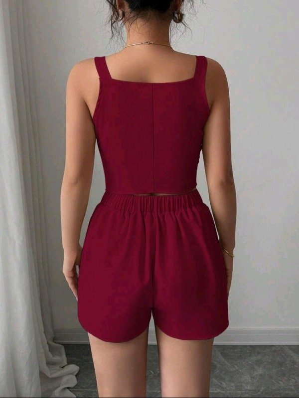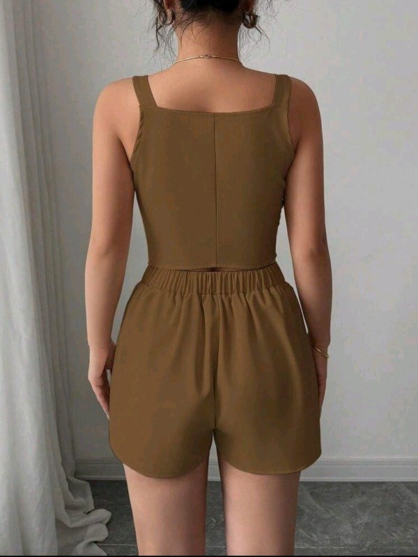 Set femenino, moderno y súper canchero. Incluye top corto con botones delanteros y short a juego, ideal para looks frescos y con estilo.