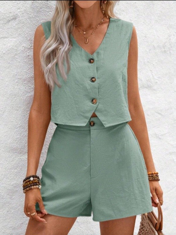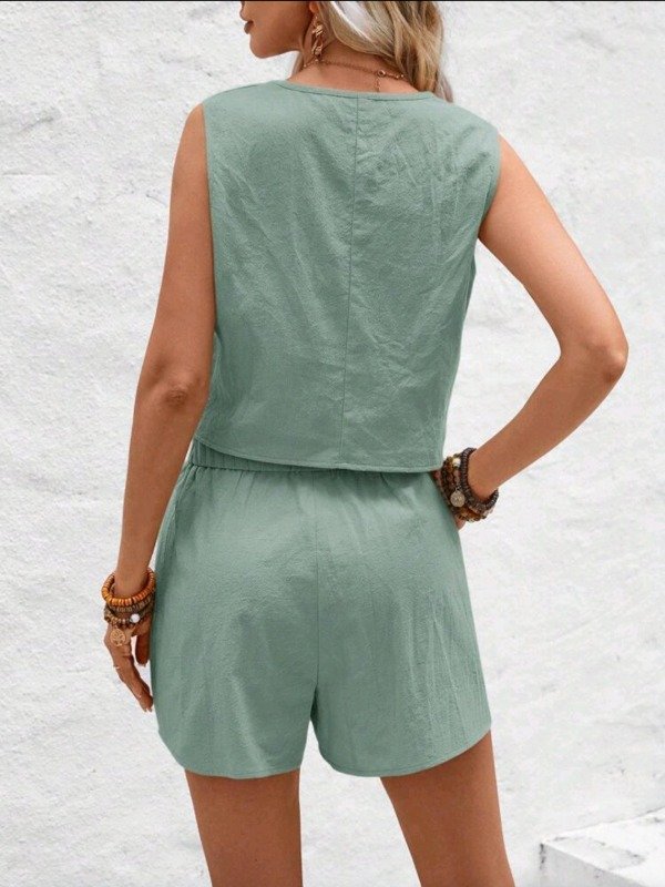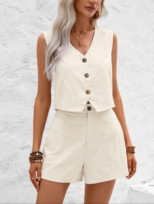 Incluye chaleco sin mangas con escote en V y botones frontales, y shorts tipo línea A de tiro medio, con un calce cómodo y relajado.