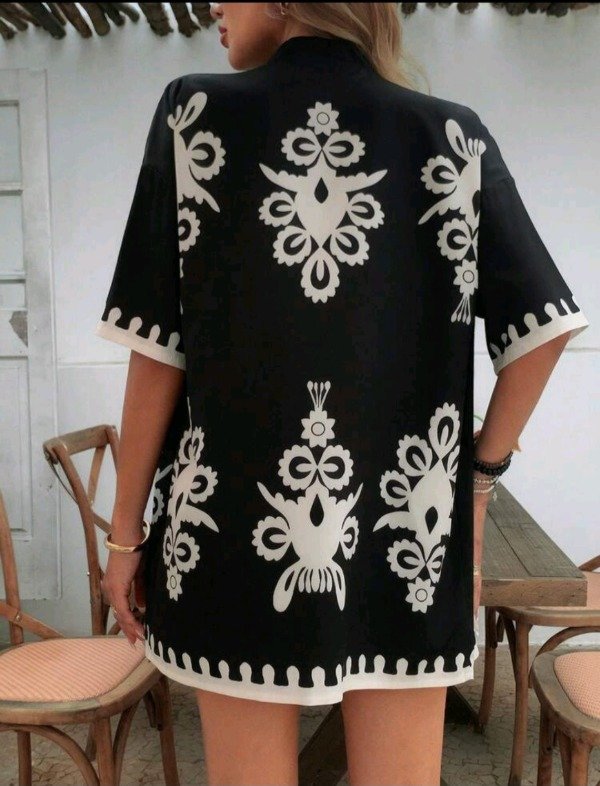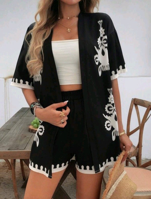 Set canchero y súper fresco para looks de día o noche. Incluye kimono liviano con estampa estilo boho y short a juego, ideal para usar con top básico y accesorios.