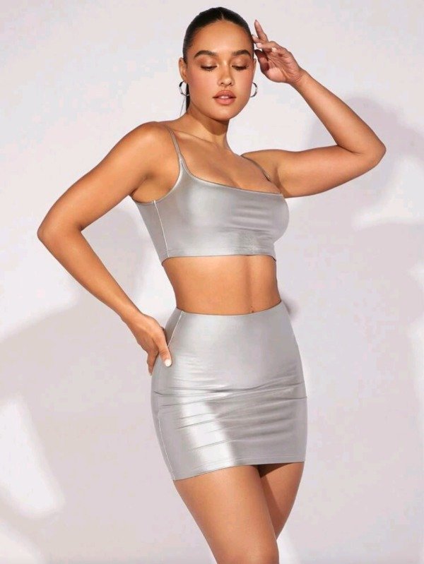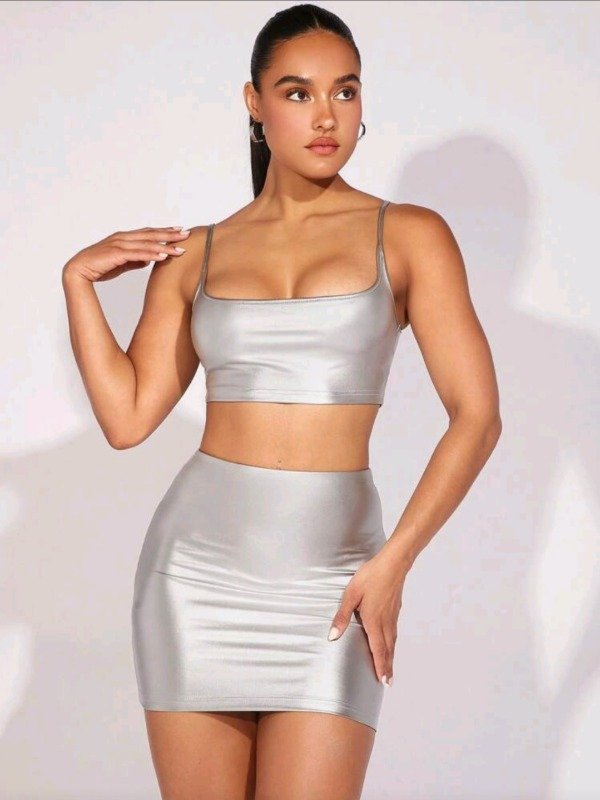 Conjunto de dos piezas SHEIN BAE compuesto por top corto y falda mini confeccionados en tela engomada con acabado metalizado plateado.
