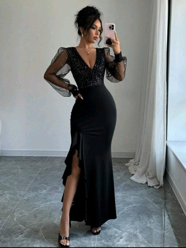 La parte superior combina brillos sutiles con mangas de tul transparente, aportando un toque glamuroso y moderno.