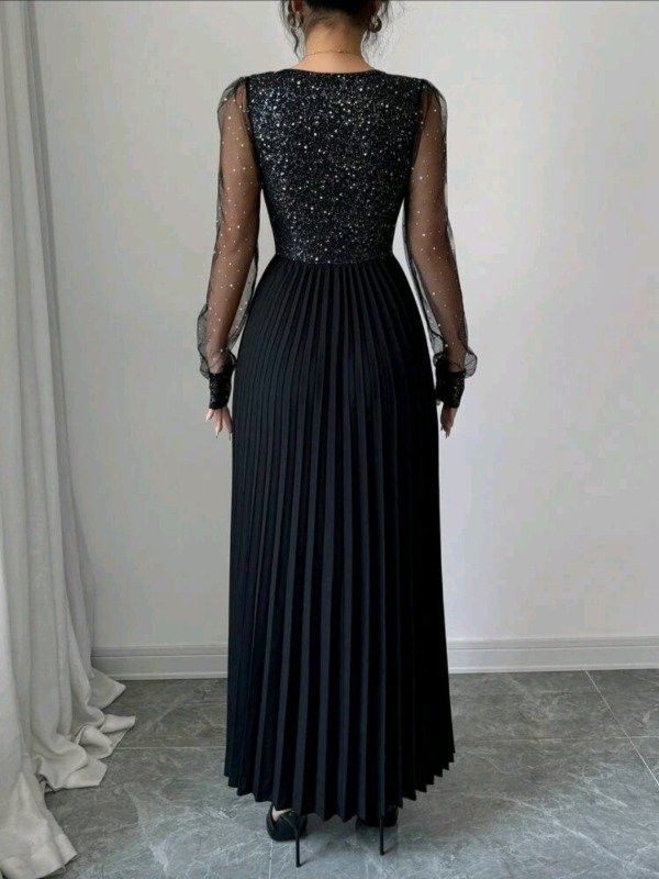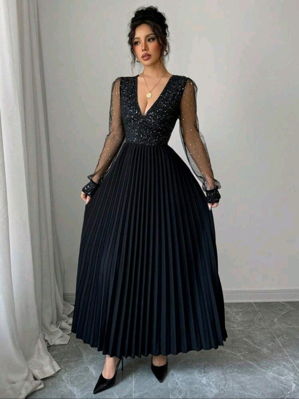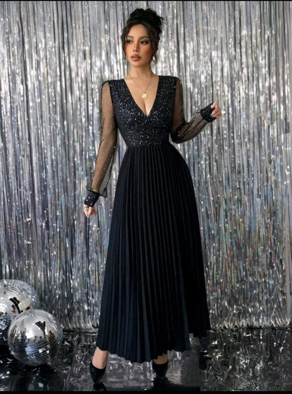 Corte: largo con falda plisada y escote en “V”.