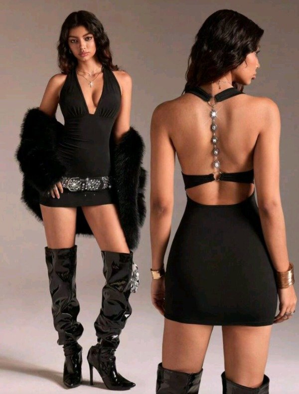 Vestido mini súper ajustado y femenino, con escote en V profundo y una espalda increíble decorada con tira de strass. Un modelo sensual, moderno y perfecto para salidas nocturnas y fiestas.