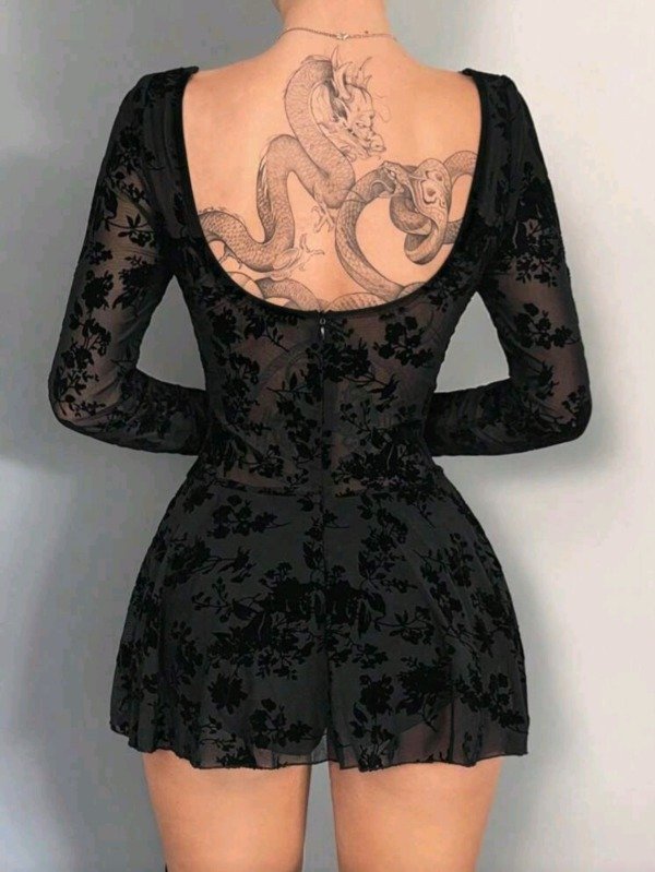Vestido corto súper elegante y sexy, con malla negra floral en flocado y short interno para mayor comodidad y seguridad.