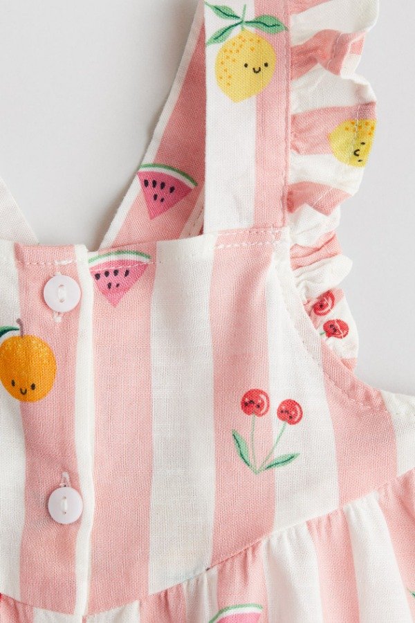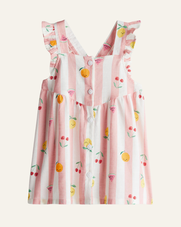 Vestido original H&M confeccionado en 100 % algodón suave, con diseño rayado rosa y blanco y divertidas frutitas estampadas.