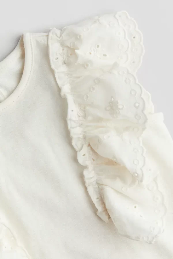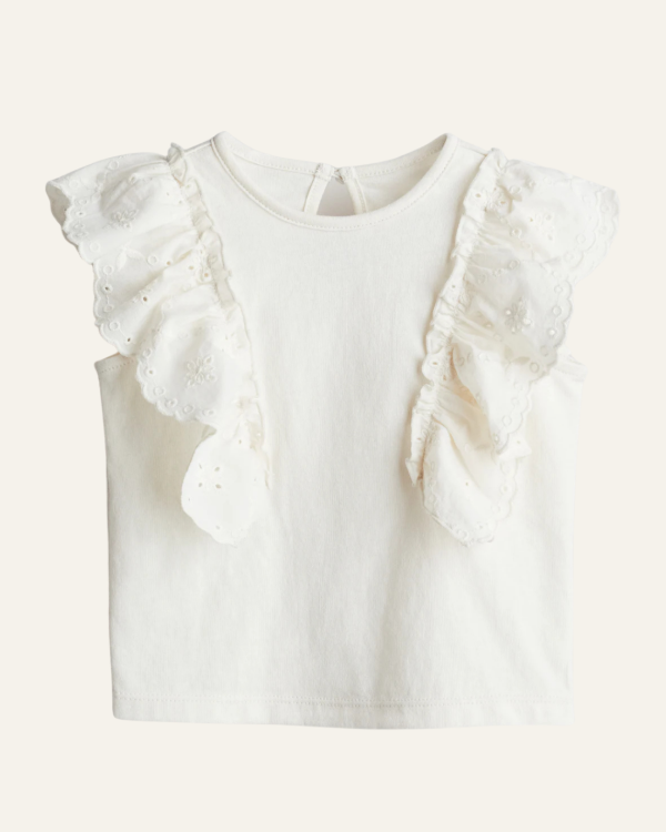 Blusa original H&M, confeccionada en 100% algodón suave, con detalles románticos de volados bordados tipo broderie en los hombros.