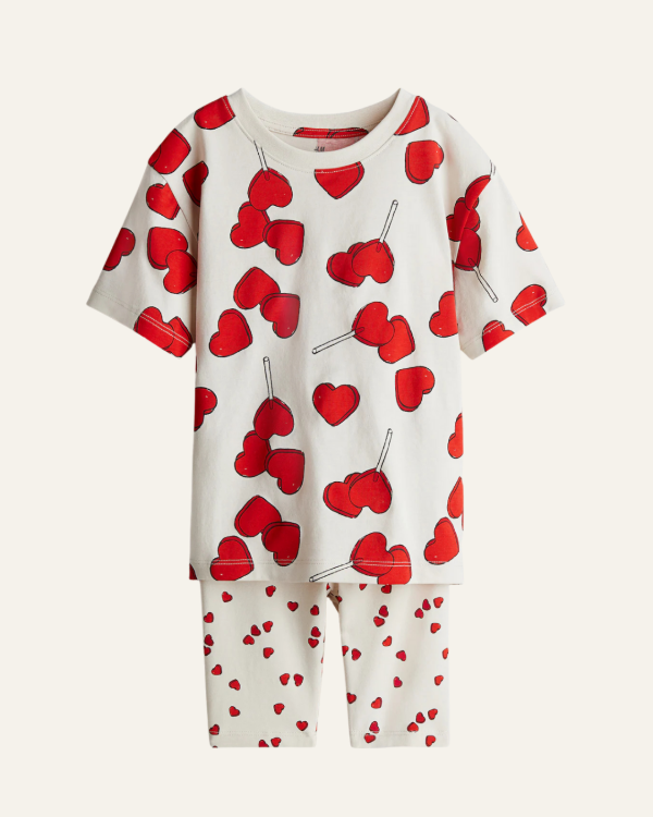 Incluye remera blanca con divertida estampa de cerezas en forma de corazones y short tipo biker con mini corazones rojos estampados.