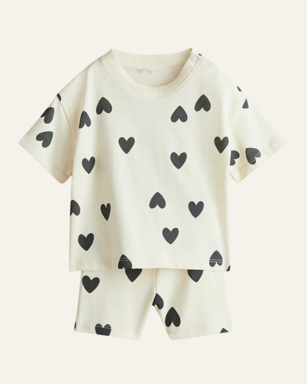 Incluye una remera color crema con estampa de corazones negros y biker a juego, cómodo y liviano.