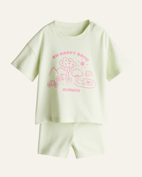 Incluye remera color verde claro con estampa en rosa pastel “Oh Happy Days! Always” y short al tono con cintura elástica para mayor comodidad.