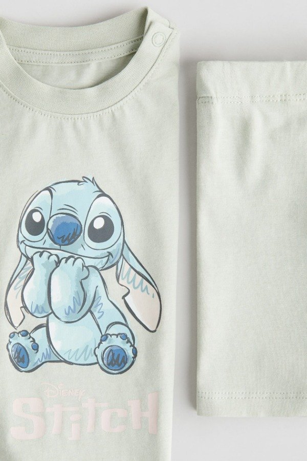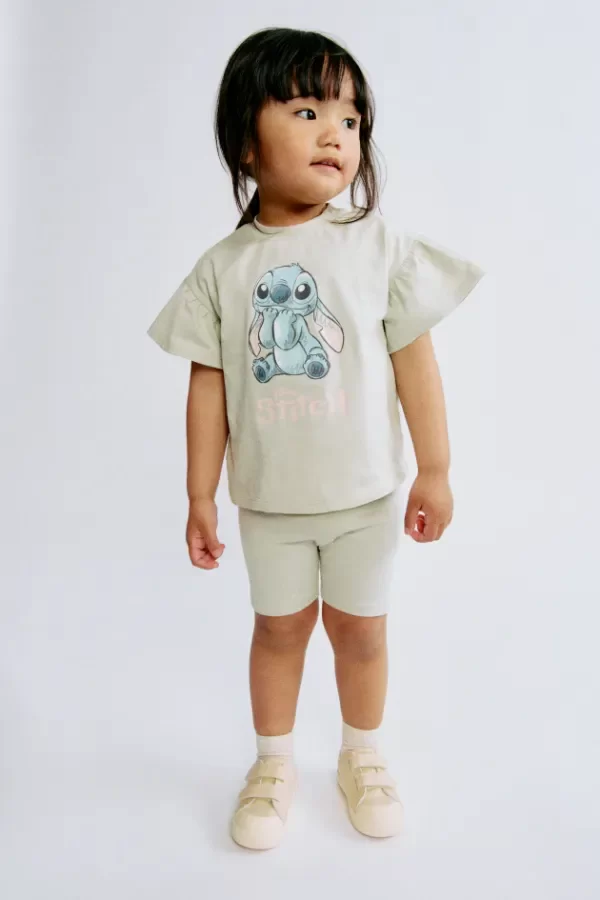 Conjunto original H&M, compuesto por remera de algodón con estampa de Stitch y biker al tono.