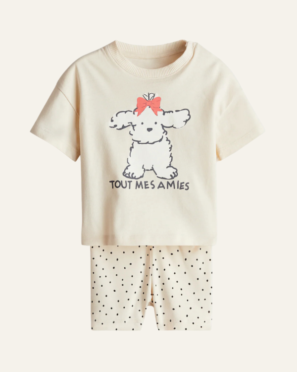 Incluye remera color crema con adorable estampa de perrito con moño rojo y la frase “Tout mes amies” (todas mis amigas 💕), y short tipo biker con diseño de mini lunares negros.
