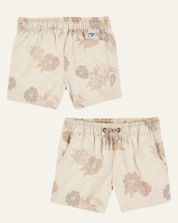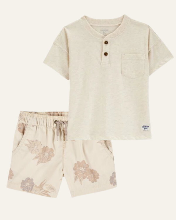Este conjunto OshKosh B’gosh para niño combina estilo clásico y comodidad en un look ideal para los días de verano. Incluye una remera Henley en color crema con cuello abotonado y bolsillo al frente, confeccionada en suave mezcla de algodón, junto con un short beige con estampa floral y cintura elástica con cordón funcional para mayor ajuste.