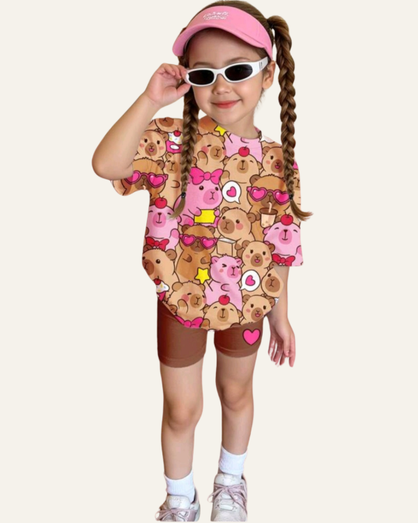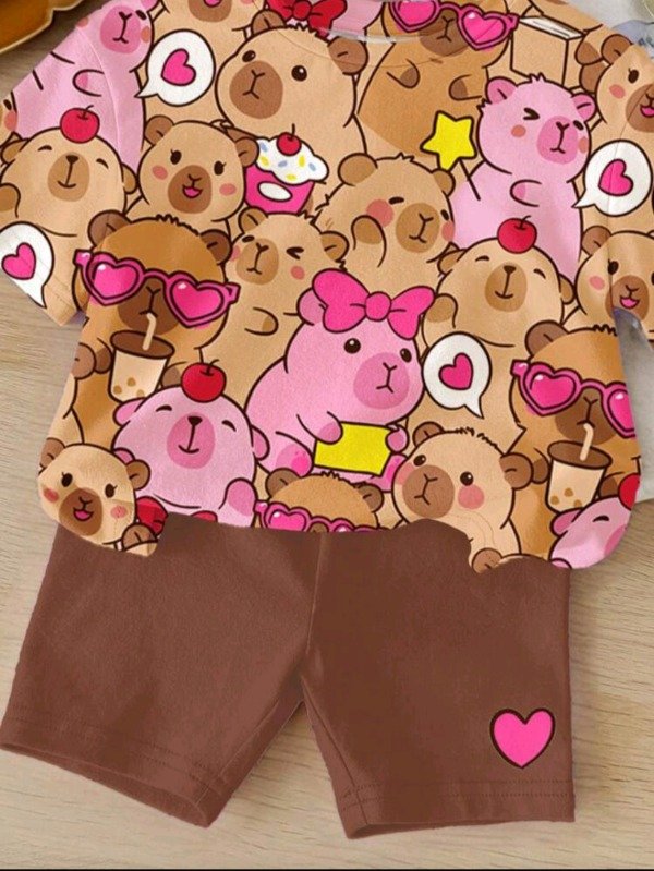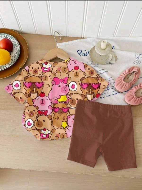 El set Shein original para niña incluye remera y short, con un diseño divertido y tierno inspirado en capy . Ideal para uso diario o para regalar, combina comodidad con un estilo moderno y alegre.