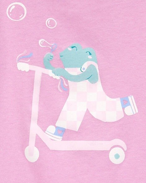 Remera de algodón suave, ideal para el uso diario. Diseño dulce y divertido con estampa de ranita soplando burbujas mientras anda en monopatín.