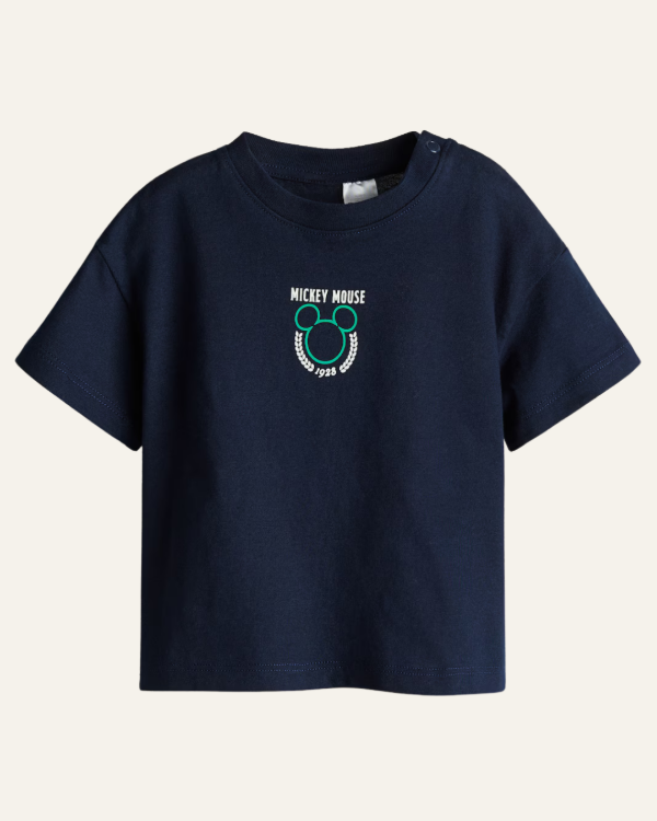 De color azul marino, trae un diseño minimalista con el logo de Mickey y la inscripción 1928, año de su primera aparición.