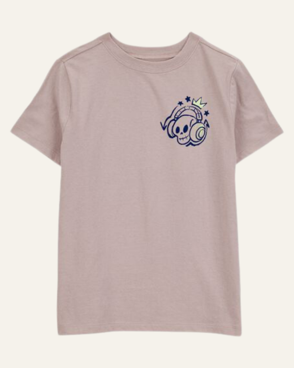 Dale un estilo moderno y divertido al look de tu hijo con esta remera marrón OshKosh de manga corta, diseñada con una gráfica exclusiva de calavera con auriculares y corona. Confeccionada en algodón suave y cómodo, ofrece un calce relajado ideal para usar durante todo el año, ya sea sola o combinada con una campera de jean o buzo.
