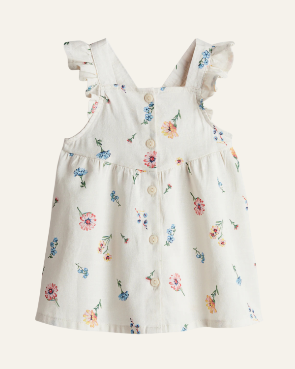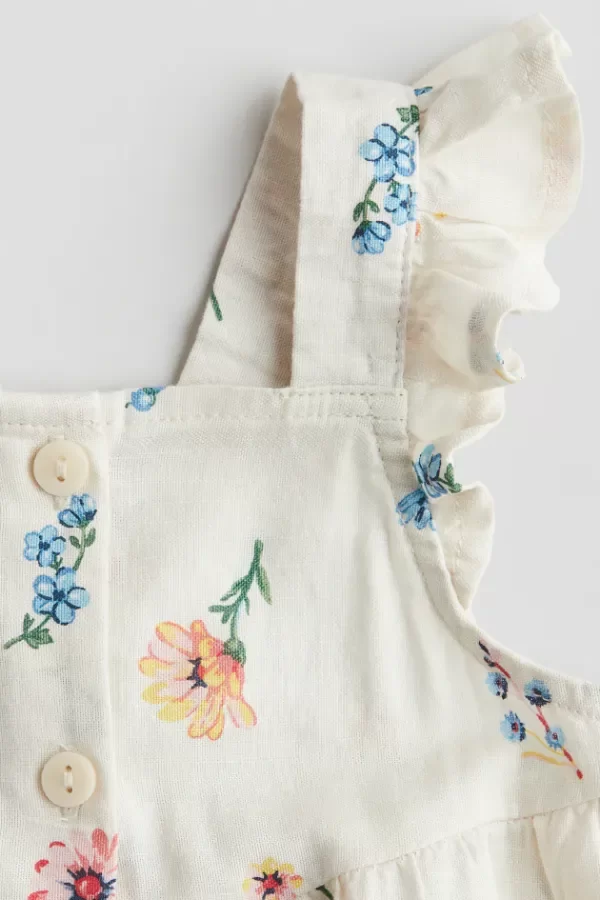 Vestido original H&M confeccionado en 100 % algodón liviano, con diseño floral multicolor sobre fondo natural.