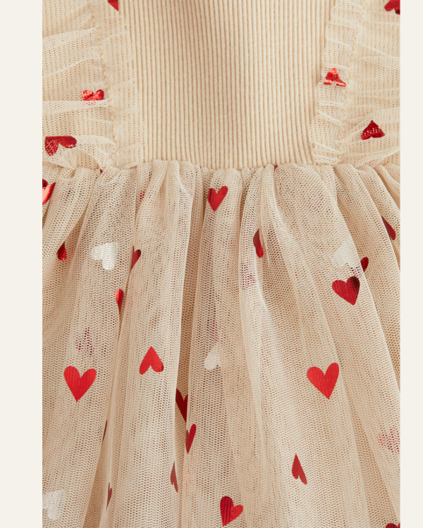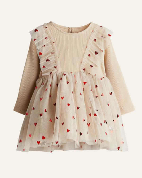 Vestido manga larga de H&M confeccionado en jersey de algodón acanalado, con falda de tul voluminosa estampada con corazones rojos. Cuenta con volados decorativos en el frente que se extienden sobre los hombros hacia la espalda, cuello redondo y cierre con botón en la parte posterior. Forrado para mayor comodidad.