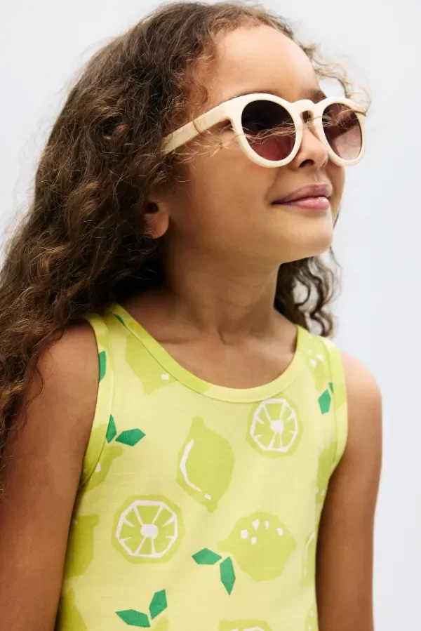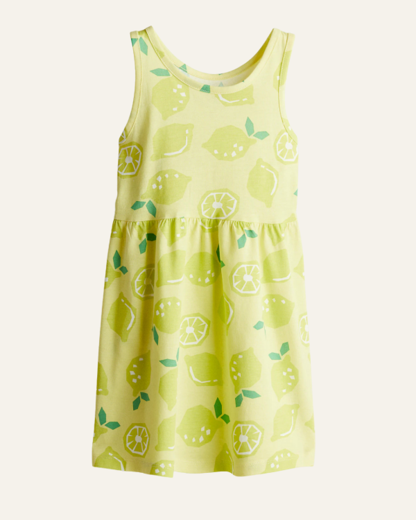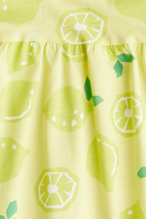De algodón suave y fresco, sin mangas y con un divertido estampado de limones en tonos amarillos y verdes, es cómodo y a la vez lleno de estilo.