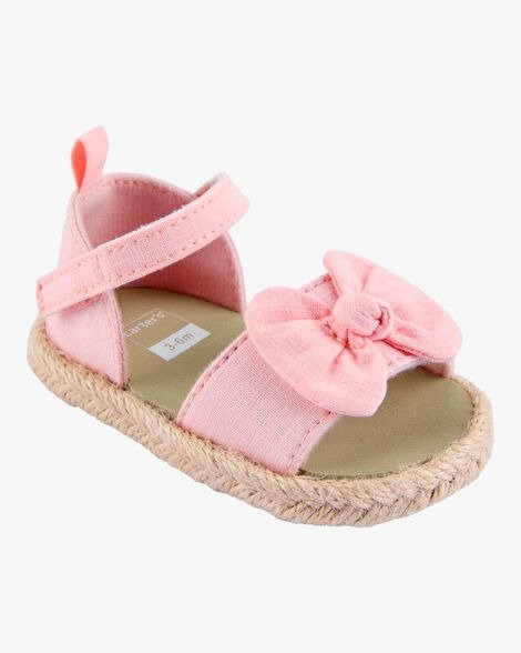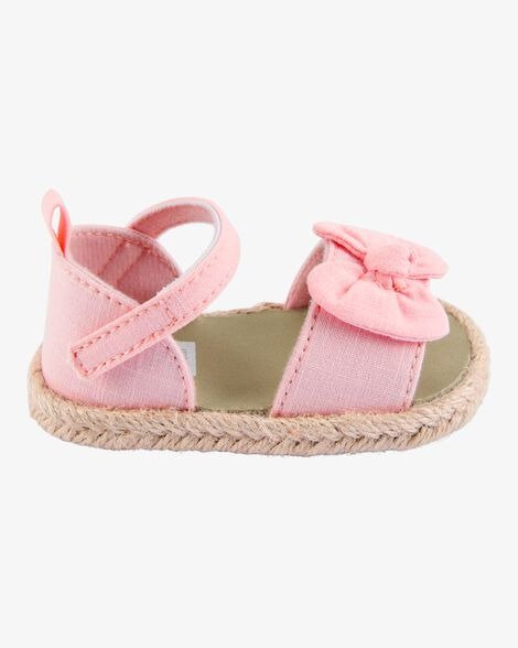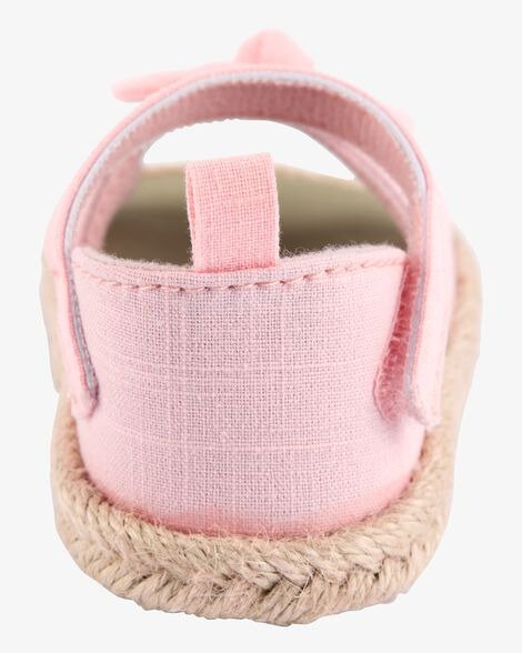 De estilo espadrille con suela tejida y moño decorativo, combinan comodidad y dulzura en un diseño clásico y fresco.